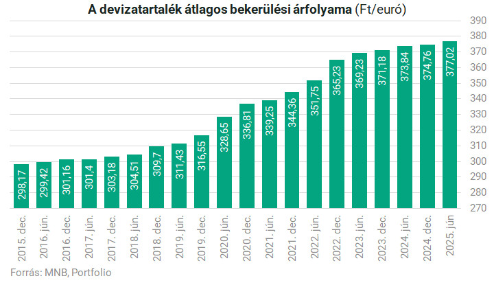 Vagyis furcsa módon az MNB-nek az eredménye szempontjából az az előnyös, ha minél nagyobb az átlagos bekerülési árfolyam és a tényleges piaci árfolyam közti különbség. A féléves jelentés szerint a devizatartalék átlagos bekerülési árfolyama június végén 377 forint volt, így adódott továbbra is nyereség a devizaváltáson.