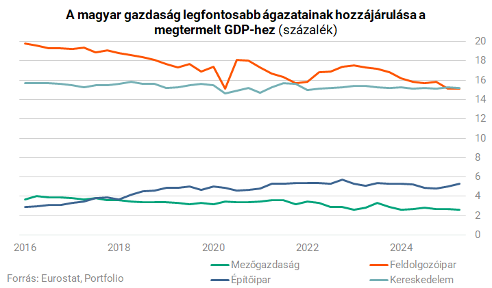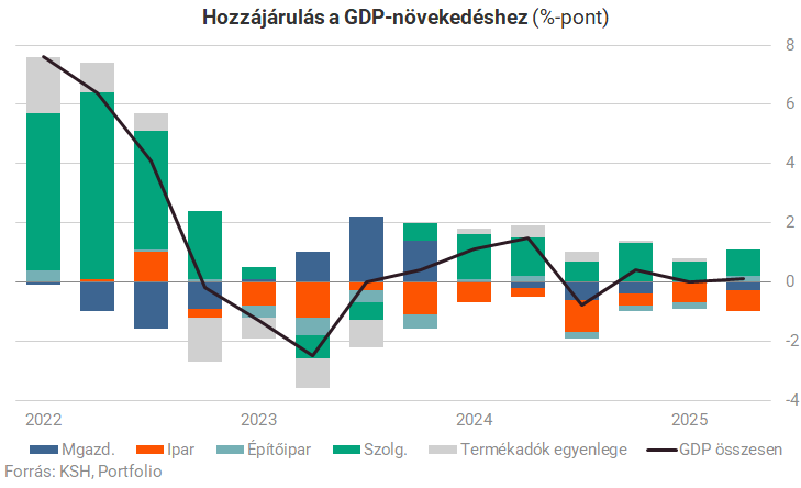 A GDP termelési oldalát vizsgálva szintén szembetűnő, hogy az ipari termelés már évek óta visszafogja a magyar gazdaságot. Bár a hatás ingadozó, éves viszonylatban jellemzően 0,5-1 százalékponttal csökkenti az ipar rossz teljesítménye a magyar gazdaság bővülését.