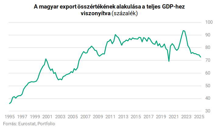 A kivitel visszaesése a hazai GDP szintjéhez képest is látványos: a 2023-ban elért csúcson az export összértéke meghaladta a bruttó hazai termék 90 százalékát, ehhez képest az idei év második felében ugyanez az arány 70 százalék közelébe süllyedt.