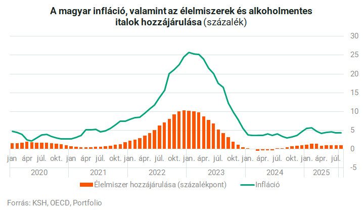 A nyersanyagárak emelkedése azonban csak részben magyarázza az élelmiszerárak megugrását, hiszen az OECD által számított élelmiszerinfláció 2019 és 2025 között több mint 45% volt szemben a FAO árindexének 30 százalékos emelkedésével.