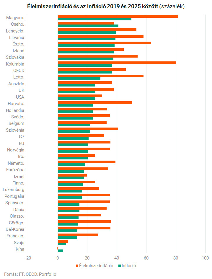 Az FT cikke azt is megvizsgálta, hogy az egyes országokban mekkora volt az élelmiszerárak emelkedésének üteme 2019 és 2025 között. A kérdéses időszakban a legtöbb országban jobban emelkedtek az élelmiszerárak, mint az általános inflációs mutató, a két kivétel Kína – és talán meglepő módon – Csehország.