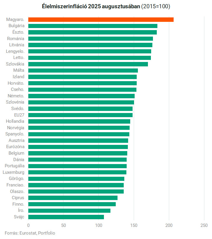 Tavaly december óta az Eurostat is külön adatbázisban vizsgálja az élelmiszerárak változását, európai összevetésben is kimagaslik a magyar drágulási ütem, hiszen 2015-höz képest több mint a duplájukra emelkedtek az élelmiszerárak.