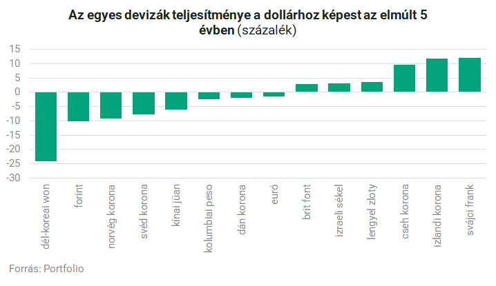 Ha a forintárfolyam hatását akarjuk érzékeltetni, akkor érdemes megnézni az érintett devizák esetében a dollárhoz mért teljesítményt az elmúlt öt évben.