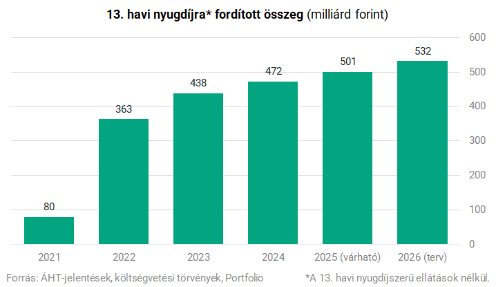 2026-ban 585 milliárd forintot szán a költségvetés a tizenharmadik havi juttatásokra, beleértve mind a nyugdíjban, mind a másmilyen nyugdíjszerű ellátásokban részesülők juttatásait is. A 2025 novemberében esedékes évközi nyugdíjemelés azonban 1,6%-kal megnöveli az egyéni nyugdíjakat, ezért várhatóan a 2026-os tizenharmadik havi juttatás is legalább 1,6%-kal magasabb lehet a tervezettnél, így az 594 milliárd forintot is elérheti. A tizennegyedik havi nyugdíj feltehetően ugyanennyibe kerülne évente, amennyiben azonos működéssel vezetik be azt.