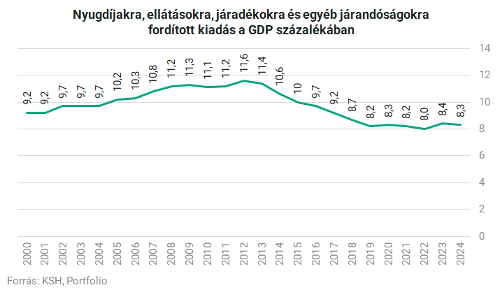 Ugyanez a relatív pozícióromlás a GDP-arányos nyugdíjkiadások szintjében is megmutatkozik. A 2012-es csúcson a magyar nyugdíjkiadások megközelítették a GDP 12 százalékát, míg 2024-re 8,3%-ra csökkent a mutató értéke, azaz az országban megképződő jövedelemből az idő múlásával egyre kisebb rész jutott a nyugdíjasoknak és nyugdíjszerű ellátásokban részesülőknek.