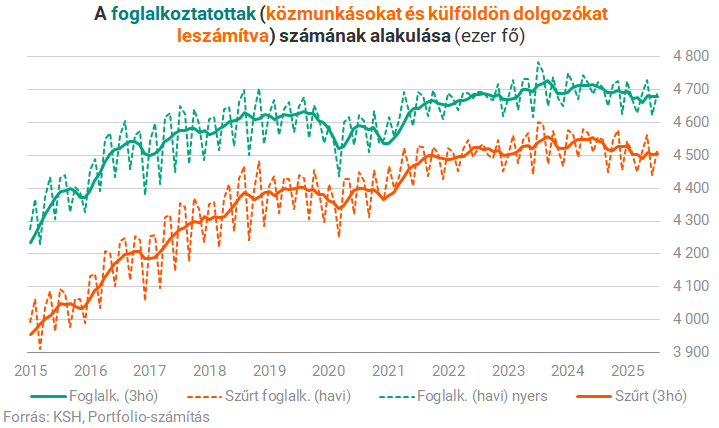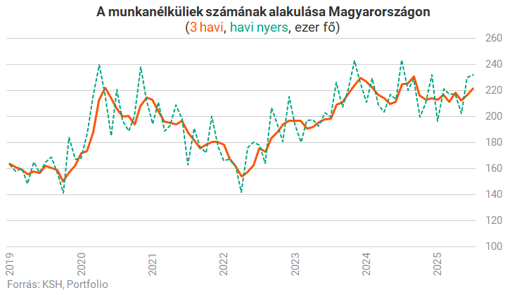 Hasonló a helyzet a munkanélküliséggel is: a 2025. július–szeptemberi időszakban a 15–74 éves munkanélküliek átlagos száma 221 ezer fő, a munkanélküliségi ráta pedig 4,5% volt. A elmozdulások mintavételi hibahatáron belüliek, bár megjegyzendő, hogy a munkanélküliek száma 10 hónap után kúszott újra 220 ezer fölé.