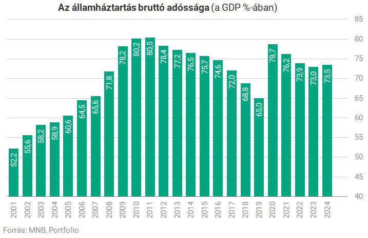 A tavalyi 73,5% után a szakértők úgy számolnak, hogy 2025 végére a GDP 74%-a lehet az adósság, majd ez 2026-ban 74,5%-ra, 2027-ben pedig 74,7%-ra emelkedhet.
