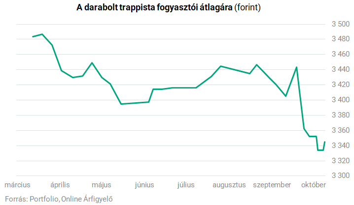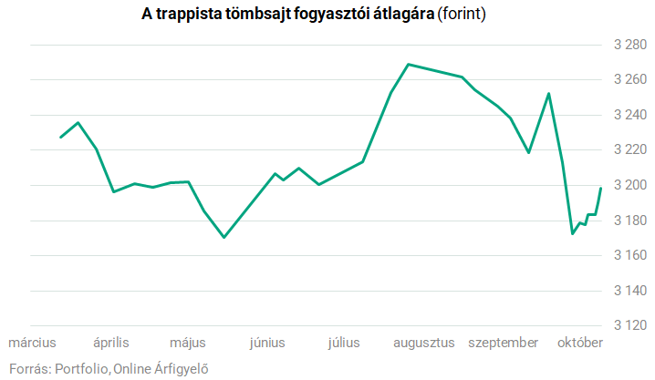 A trappista tömbsajt ára 2025 tavasza óta viszonylag stabil, 3200 forint körül mozgott, csak októberben látszott kisebb emelkedés.