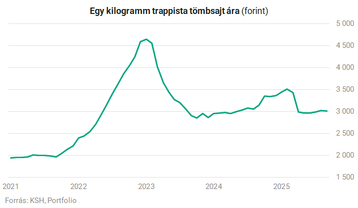 A KSH statisztikái alapján a trappista ára 2021 elején még 1940 forint/kg körül mozgott, majd 2022 végére 4590 forint/kg-ra emelkedett. Ezután az árak visszarendeződtek, 3 ezer forint körüli szintre, és a drágulást az árrésstop tudta megfogni 2025 tavaszán.