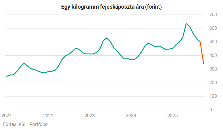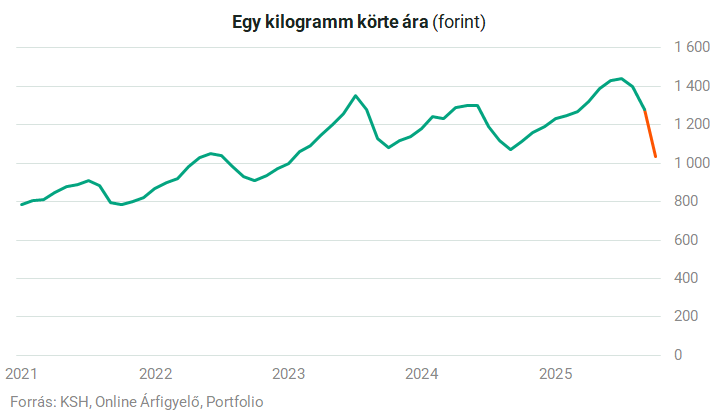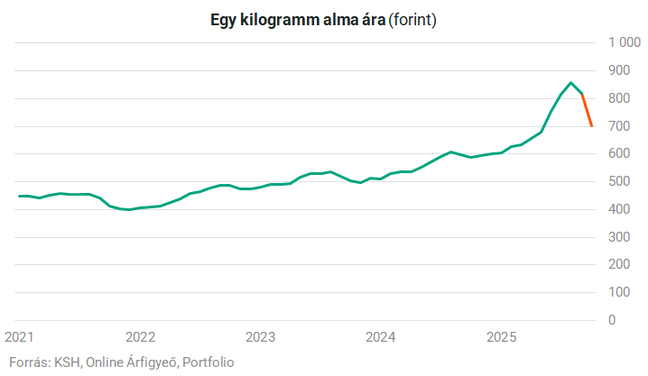Az idei jelentős drágulás mögött az áll, hogy történelmi szinten gyenge volt a termés. A fagyok, a kora nyári aszály és a régóta zsugorodó, elöregedő ültetvényállomány miatt 2025-ben mintegy 160 ezer tonnára becsülték a hazai almatermést, ami messze elmarad a szokásostól. z ősz folyamán a főbb fajták nagybani ára jóval a 2024-es szint fölé került, ami a kiskereskedelmi árakba is begyűrűzött. Most csökkenés látható a KSH és az Online Árfigyelő szerint is.