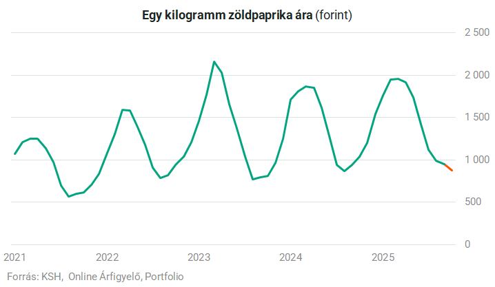 A zöldpaprika esetében a szezonális minta jól ismert: tavasszal, amikor a hajtatott (fóliasátras) termékek dominálnak, az árak magasak; nyáron és ősszel, a szabadföldi betakarítás idején viszont lejtmenetbe kerülnek, majd télre – amikor ismét több az import és a tárolt áru – fokozatosan emelkedni kezdenek.