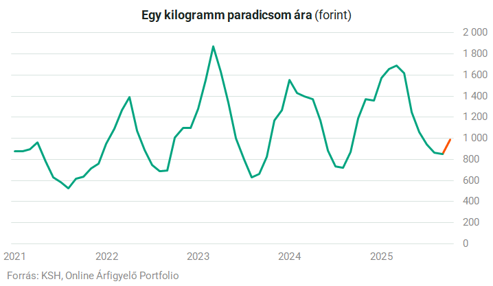 Hasonló a helyzet a paradicsom esetében, annak ára jellemzően tél elején kezd ismét felfelé mozdulni, amikor a hazai szabadföldi szezon kifut, és a fűtött hajtatás, illetve az importtermékek kerülnek túlsúlyba.