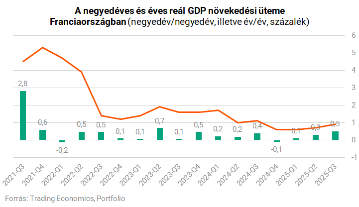 A politikai feszültségek ellenére a francia GDP a vártnál gyorsabban nőtt a harmadik negyedévben. A 0,5 százalékos bővülés meghaladta a második negyedévi 0,3 százalékot és jócskán felülmúlta a piaci konszenzust (0,1 százalékos bővülés). A részletek is kedvezőek: a belföldi kereslet javult, elsősorban a beruházások, különösen a vállalati fejlesztések élénkülése miatt. A háztartások fogyasztása továbbra is nőtt (+0,1 százalék), az állami kiadások pedig 0,5 százalékkal emelkedtek. Összességében a végső belföldi kereslet 0,3 százalékponttal járult hozzá a növekedéshez.