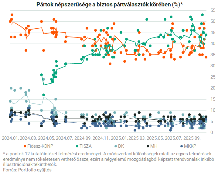 A szokásos ellentmondásosság jellemzi a közvélemény-kutatásokat az ősszel is. A nyilvánosságra került 14 felmérésből 9 a Tisza Párt biztos előnyét mérte a biztos szavazó pártválasztók között, 5 viszont továbbra is a Fidesz magabiztos vezetését regisztrálta. Előbbiek esetében átlagosan 10 százalékpont körüli a Magyar Péter vezette politika alakulat előnye, utóbbiaknál viszont nagyjából 6 százalékpont a hátránya. Ha ebből megpróbálunk egy idősort képezni, furcsa kép tárul a szemünk elé: