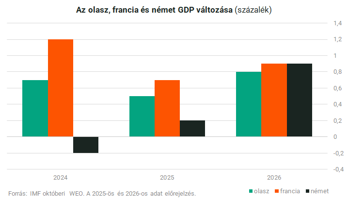 A hervatag olasz növekedés még rosszabbul néz ki, ha kontextusba helyezzük. A németeknél ugyan tavaly és várhatóan idén is dinamikusabban fognak fejlődni, jövőre Berlin már átveheti tőlük a vezetést. A franciák jobban teljesítenek náluk, pedig róluk mostanság a legtöbbet a hosszú ideje tartó kormányválság és a költségvetési viták miatt lehet hallani.