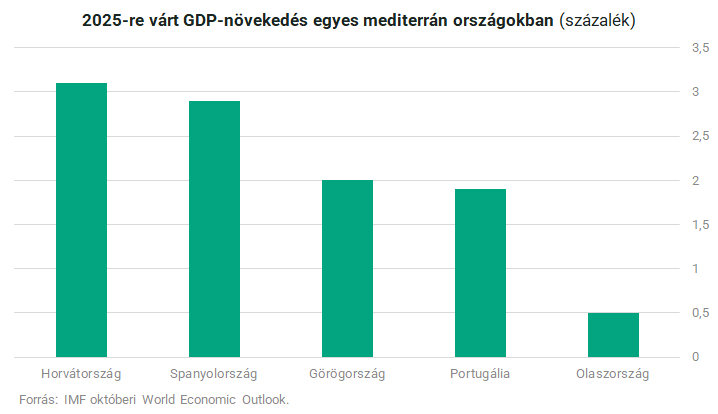 Az EU-s mediterrán tagországokhoz viszonyítva válik igazán szembetűnővé a lemaradás. Jelenleg ezek az országok az európai növekedés hajtómotorjai a szépen teljesítő turisztikai szektoruknak és a jól elköltött uniós pénzeknek köszönhetően. Olaszországban azonban a turizmus nem volt képes hasonló dinamizáló szerepet betölteni, az uniós források felhasználását pedig lassú bürokrácia nehezíti.