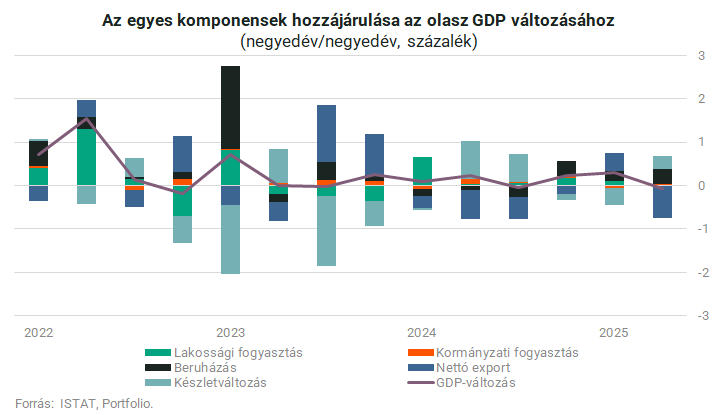 A mostani adat mögött az áll, hogy míg a mezőgazdasági termelés ugyan képes volt bővülést felmutatni, addig az ipar csökkenő trendben van, a szolgáltatások pedig stagnálnak az olasz statisztikai hivatal, az Istat közlése szerint. A háztartások fogyasztása csökkent, az export az amerikai vámok ellenére képes volt nőni.