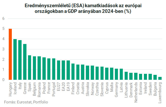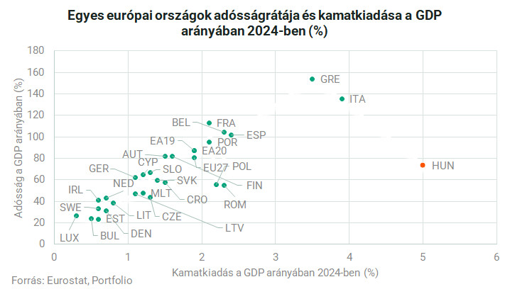 Az ország a bruttó hazai termékhez viszonyítva több kamatot fizet államadóssága után, mint bármely más uniós tagállam,