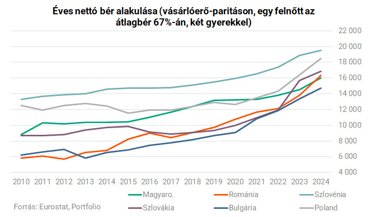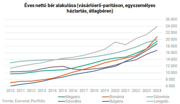 Az alábbi ábra megmutatja, hogy a nettó, vásárlóerő-paritáson számolt bérek (árszinttel korrigált bér, PPS) hogyan alakultak tavaly.