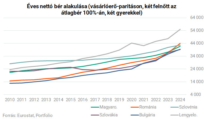 Az alábbi néhány ábrán megnéztünk pár háztartástípust is, hogy miként alakul Magyarország helyzete néhány régiós országhoz képest. Az eredmény nem szívderítő, de sokkal árnyaltabb a kép, mint ahogy a bruttó, árszinttel nem korrigált bérek sejtetik.