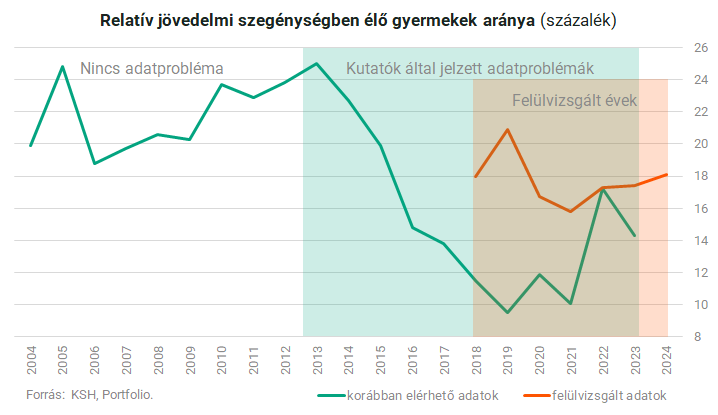 Míg az összetett szegénységi mutató, a "szegénység vagy társadalmi kirekesztődés kockázatának kitettek aránya" valóban nem mutatott nagy elmozdulást, a relatív jövedelmi szegénységi ráta – amiről mindeddig szó volt -, már annál inkább. (Az egyes szegénységi mutatók tartalmáról és jelentőségéről lásd keretes írásunkat alább.) A korrekció olyan jelentős volt, hogy 2020-ban például megduplázta a gyerekszegénységet – derült ki Élő Anita cikkeiből.