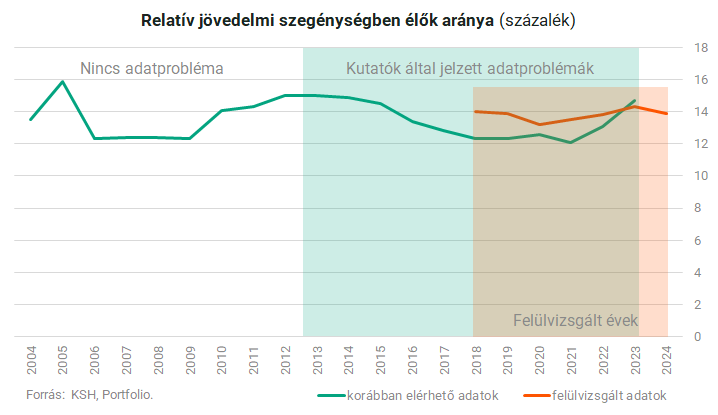 - Egyrészt a felülvizsgálat általában nagy töréseket hozott a relatív jövedelmi szegénység adatsoraiban, amik lehetetlenné teszik, hogy összehasonlítsuk a 2018 előtti és utáni adatokat, és így az egyes szociálpolitikai lépések hatása sem mérhető,