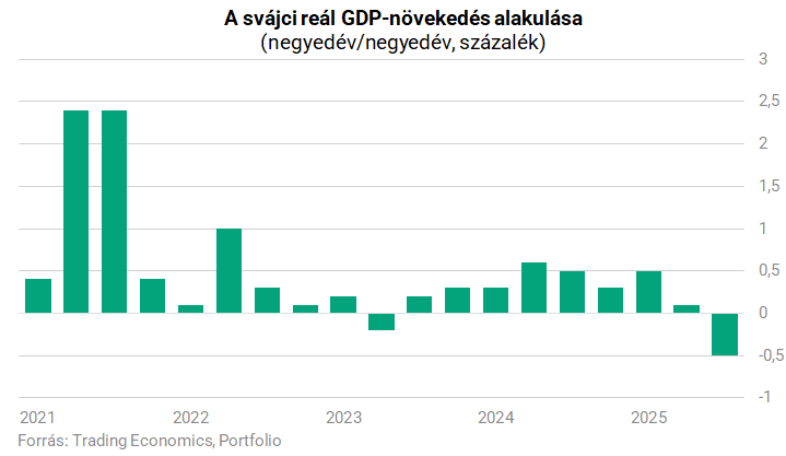 A SECO (Államtitkárság a Gazdasági Ügyekért) előzetes becslése szerint negyedéves alapon 0,5 százalékkal zsugorodott a svájci gazdaság, mutatva a 39 százalékos amerikai vámok negatív hatását. A szezonálisan és sportesemények hatásától kiigazított adat szintén visszaesést mutat. A szakértők szerint a gyengülés fő oka a vegy- és gyógyszeripar hozzáadott értékének éles visszaesése volt, ami az ipar egészét lefelé húzta. Valószínű tényezőként említik az Egyesült Államok által kivetett jelentős vámokat, valamint a korábbi negyedévekben tapasztalt előrehozott szállítások kifutását. A szolgáltatások bővülése szintén az átlag alatt maradt.