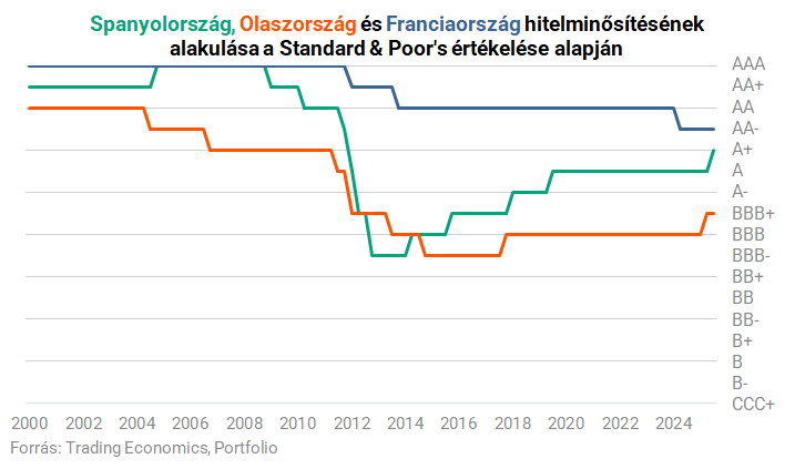 Az elmúlt években Spanyolország kockázati besorolása a 2010-es évek elején látott "BBB-"-ról (ami a befektetésre ajánlott kategória legaljának felel meg) mostanra "A+"-ig emelkedett, és már csak alig van lemaradva a korábban az EU egyik legjobbjának számító Franciaországtól.
