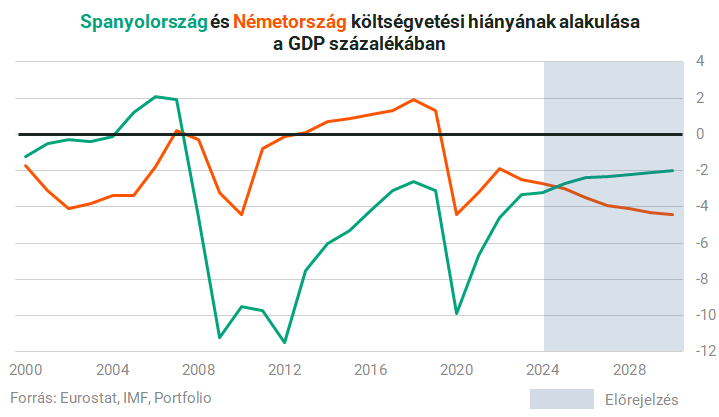 Bár a gazdasági bővülés önmagában is mérsékli az államadósságot (erre szokás azt mondani, hogy az ország nominálisan "kinövi" a terheket), mindezt a kormány fegyelmezett költségvetési politikával támogatta. Így fordulhat elő, hogy a Nemzetközi Valutaalap (IMF) 2025-re szóló becsléseiben a német GDP-arányos államháztartási hiány már meghaladja a spanyolét (3 százalék, illetve 2,7 százalék), amire 20 éve nem volt példa. Az IMF előrejelzései szerint az ibériai ország költségvetési hiánya ráadásul a következő években is fokozatosan szűkülni fog, 2030-ra pedig a GDP 2 százalékára csökkenhet.