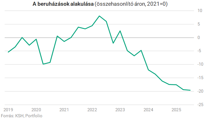 Így a harmadik negyedévben a 2022 közepi csúcshoz képest 28%-kal van lejjebb a beruházások szintje Magyarországon.