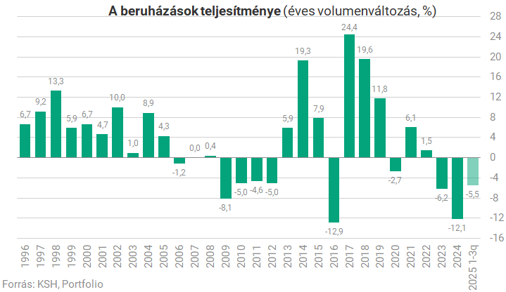 Az első három negyedévben a beruházási teljesítmény 5,4%-kal múlta alul a tavalyi nagyon gyenge szintet. A beruházások három egymást követő évben zsugorodnak Magyarországon, ennél hosszabb időszakra nyúló visszaesést az elmúlt három évtizedben csak egy alkalommal, a pénzügyi válságban láthattunk.