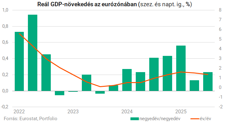 Az elmúlt három hétben az euróövezeti makroadatok többsége pozitív meglepetést hozott, a harmadik negyedéves GDP-adatok ugyanis általában felülmúlták az elemzői konszenzust. Az euróövezet egésze 0,2 százalékos negyedéves és 1,4 százalékos éves növekedést ért el, amit főként a vártnál erősebb francia gazdasági teljesítmény (+0,5 százalék, negyedéves alapon) és a továbbra is dinamikus spanyol teljesítmény (+0,6 százalék) támogatott. Németország és Olaszország stagnált, de egyre több jel mutat arra, hogy a nyári visszaesést maga mögött hagyta a térség.