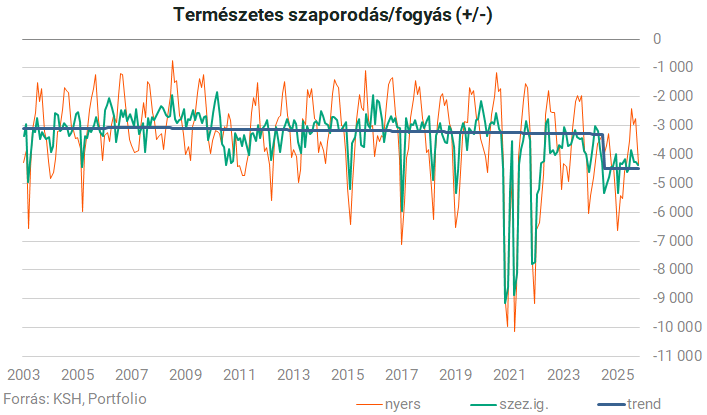 Kedvező fejlemény viszont, hogy a halálozások száma csökken. Októberben 10 333 fő vesztette életét, 6,8%-kal kevesebb az egy évvel korábbinál. Emiatt a természetes fogyás a 2024. októberi 4424-gyel szemben 4354 fő volt, vagyis elsőre úgy tűnhet, hogy a népességcsökkenés nem gyorsul. Ugyanakkor messzebből rátekintve a folyamatokra láthatjuk, hogy a fogyás felgyorsult. Korábban havonta bő háromezerrel lettünk kevesebben a halálozási-születési egyenleg következtében, mostanra ez 4500 körül jár.
