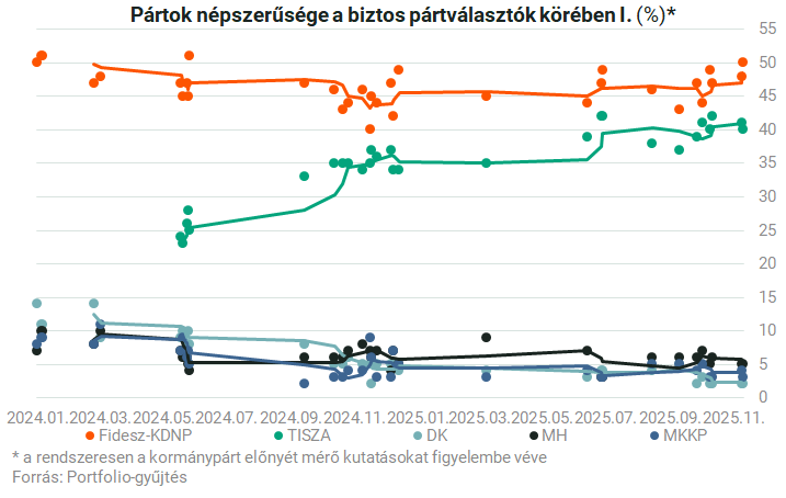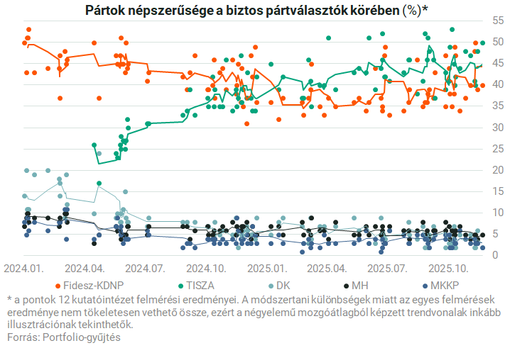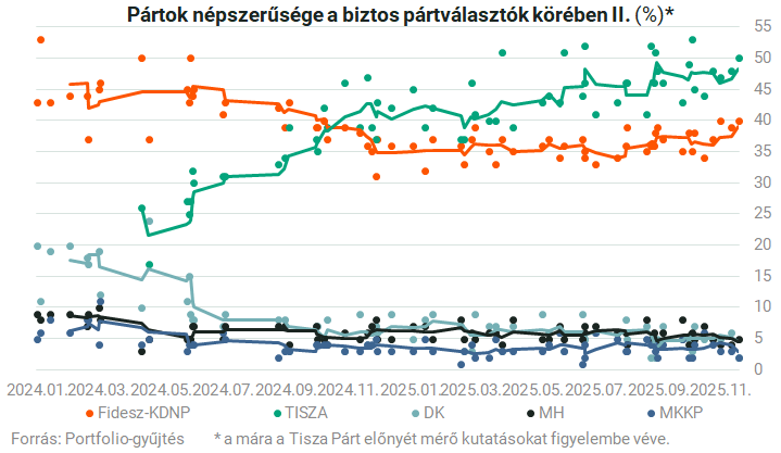 Kicsit más tendencia rajzolódik ki a Tisza-előnyt mérő közvélemény-kutatók eredményeiből. Ezekben azt látjuk, hogy az ellenzéki erő támogatottsága historikus csúcson van, viszont az ősz során nem nőtt tovább. A Fidesz népszerűsége viszont kissé nőtt, a biztos szavazó pártválasztók körében 40% felé közeledett.
