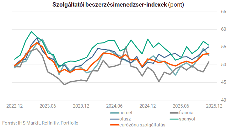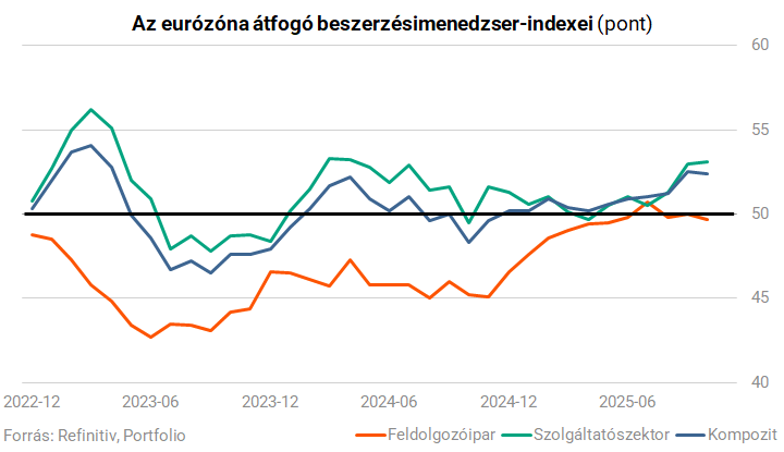 A Hamburg Commercial Bank (HCOB) euróövezeti kompozit beszerzésimenedzser-indexe (BMI) az októberi 52,5 pontjról 52,8-ra emelkedett novemberben, így sorozatban a hatodik hónapja javult. A szolgáltatások indexe 53,0-ról 53,6 pontra nőtt, ami 2023 májusa óta a legmagasabb érték. Ebben szerepet játszott, hogy az új megrendelések volumene 18 havi csúcsra gyorsult.