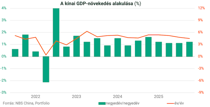 A mostani növekedést tehát szépíti az, hogy a külkereskedelmi többlet 2025-ben új rekordot ért el, 1200 ezer milliárd dollárra nőtt, ami a GDP több mint 6 százalékának felel meg. Ebben szerepe volt annak, hogy a Trump-adminisztráció második ciklusában újraéledő vámháború paradox módon rövid távon még segítette is a kínai kivitel növekedését: