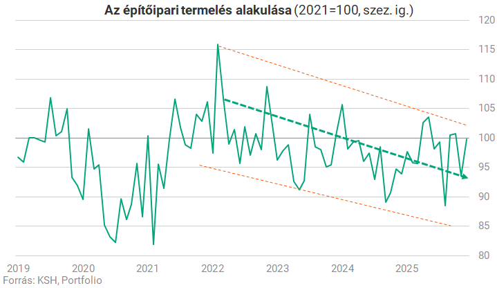 Az ágazatról hónapról hónapra elmondhatjuk, hogy óriási kilengéseket produkál, ebből a szempontból a tavalyi év különösen látványos. Tavasszal még egész magasra szökött az építőipari termelés, majd nyár végén jelentőset zuhant, aztán a felpattanást követően újra lefelé vette az irányt. Ezt mutatja az alábbi ábránk. Mint látható, az utóbbi négy évben a havi teljesítmény egy nagyon széles sávban ingadozik. Ez a sáv viszont továbbra is lefelé tart, igaz, az idén többször megközelítette a felső szélét.