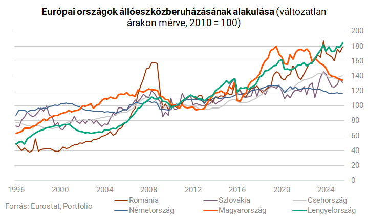 Az állóeszköz-beruházások 4,7 százalékkal nőttek éves szinten a negyedik negyedévben, ami lassulást jelez a harmadik negyedévi 7,1 százalékhoz képest. A növekedést továbbra is főként az állami beruházások hajtják, míg a magánszektor aktivitása visszafogott maradt. A csökkenő kamatkörnyezet és a Nemzeti Helyreállítási Terv (KPO) keretében induló projektek 2026-ban támogathatják a beruházások bővülését.