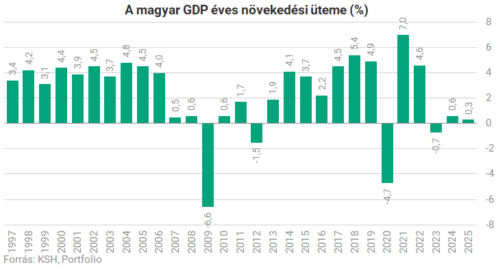 Összességében 2025-ben a magyar gazdaság teljesítménye 0,3%-kal volt magasabb az egy évvel korábbinál. Ez még a 2024-esnél is gyengébb, pedig 2025 elején még 2,5-3 százalékos várakozás jelentette a konszenzust. Az elhúzódó pangás az idei kilátásokat is beárnyékolja. A kormány 2,5-3 százalékos növekedést vár az idénre, ehhez értelemszerűen jelentős élénkülésre van szükség.