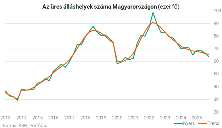Hol van már az extrém munkaerőhiány? A 100 ezer betöltetlen álláshely? A magyar gazdaság évek óta tartó stagnálása miatt egyre kevesebb a nyitott pozíció. A tavalyi év végére már kevesebb mint 65 ezer üres álláshelyet számlált a statisztikai hivatal, ami óriási visszaesést jelent a 2022-ben mért rekordmagas szinthez képest.