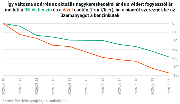 Egyre nagyobbra nő tehát a különbség a védett árakhoz képest: a 95-ös benzin piaci ára ma 67 forinttal magasabb, mint az 595 forintos benzin védett ára, a gázolaj piaci ára pedig jelenleg 97 forinttal magasabb, mint a 615 forintos gázolaj védett ára.