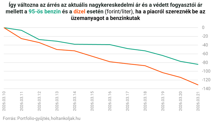 a 95-ös benzin piaci ára mától 84 forinttal magasabb, mint az 595 forintos benzin védett ára, a gázolaj piaci ára pedig jelenleg 131 forinttal magasabb, mint a 615 forintos gázolaj védett ára.