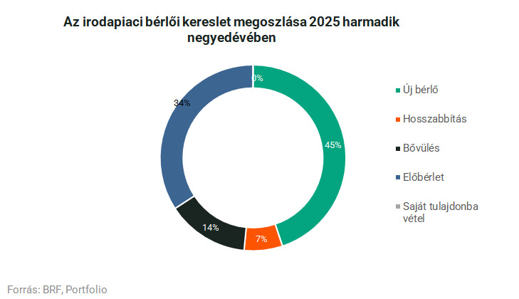 A teljes keresleten belül a szerződéshosszabbítások 41%-os részesedéssel bírtak, az új szerződések a bérbeadások 29%-át tették ki, míg a bővülések mindössze 9%-ot. Egy előbérleti szerződést regisztrált a BRF, ami a teljes kereslet 22%-át teszi ki.