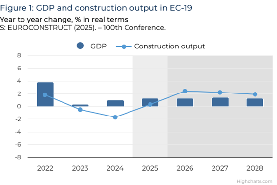 ahogy a javuló pénzügyi feltételek, a hosszú távú infrastrukturális programok és a fenntartható felújítás iránti kereslet kombinációja várhatóan segít az ágazat stabilizálásában idén, és támogatja majd a növekedést 2026-tól kezdődően.