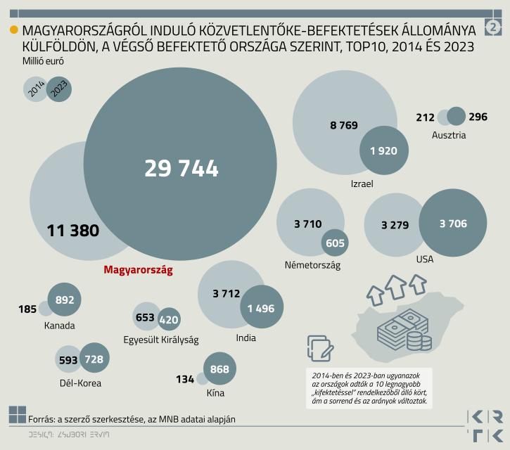 (Összehasonlításképpen: a Magyarországon megvalósított külföldi közvetlentőke-befektetések állománya 2023 végén több mint 100 milliárd eurót tett ki.)