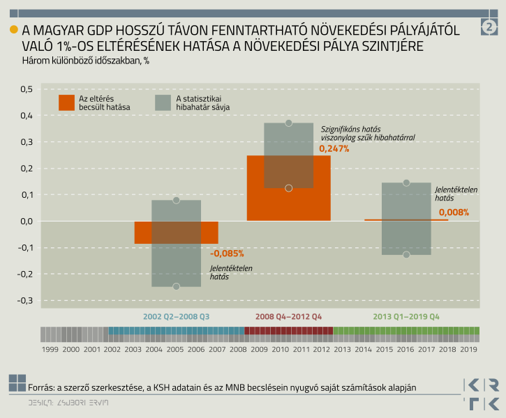 A pénzügyi válság által okozott hosszú távok károk hasonlóan jelentkeztek a magyar gazdaságban, mint az amerikaiban. Ennek a hiszterézis hatásnak a mértékét szemlélteti az alábbi ábra, amelyen az látható, hogy hány százalékkal változtatta meg a magyar GDP hosszú távon fenntartható növekedési pályájának szintjét egy attól való egyszázalékos eltérés a becsléseim szerint a három vizsgált időszakban. A hosszú távon fenntartható növekedési pálya becslését az MNB 2024. júniusi Inflációs Jelentéséből kölcsönöztem. A becsült adatsor 2002 elején indul, ezért rövidült meg a válság előtti időszak.