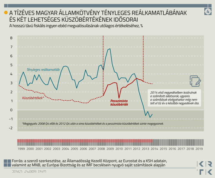 A pénzügyi válság és az azt követő recesszió időszaka alatt hiába kényszerült a magyar állam magasabb reálkamatláb mellett kötvényeket kibocsátani, így sem zárhatjuk ki, hogy önmagukat finanszírozták a kiadásai hosszú távon. Ennek oka egyszerűen az, hogy már rövid távon sem volt kizárható a fiskális ingyen ebéd elérhetősége, ami ilyenkor hosszú távon is automatikusan elérhető marad: ezért emelkedett a reálkamatláb küszöbértéke a végtelenbe. Ez az eredmény sem tekinthető azonban robusztusnak.