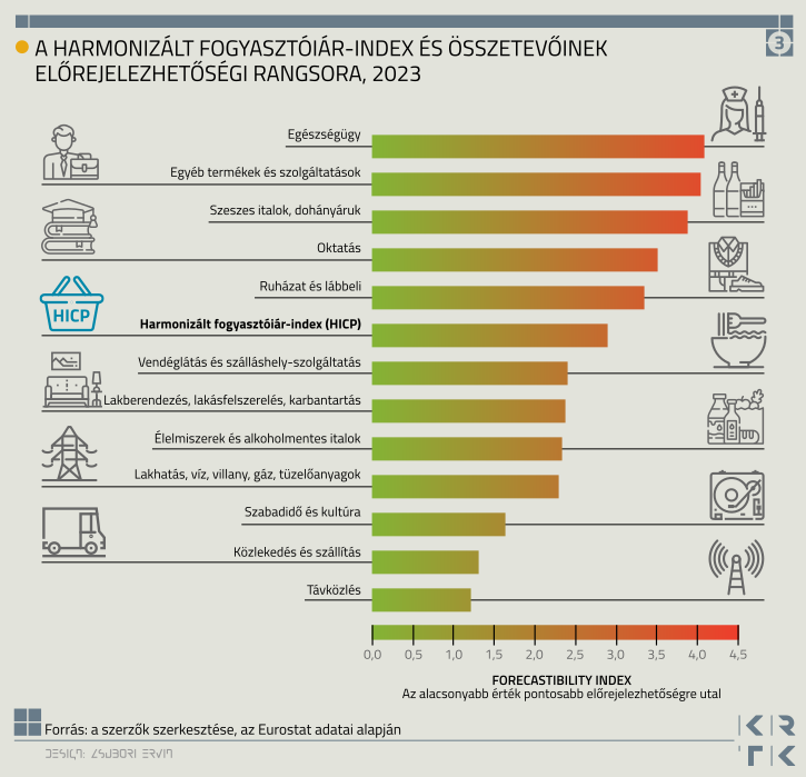 2023-ban az egészségügyi, valamint az alkoholos italok és vegyes szolgáltatások kategóriái voltak a legnehezebben modellezhetők, ami jól tükrözi a háborús és energiapiaci sokkok hatását. A 2023-as helyzet már egy egészen más típusú kihívást jelentett. Az energiaválság, az ellátási láncok akadozása és a háborús bizonytalanság olyan tényezőket vitt be a rendszerbe, amelyekre a modellek korábbi tapasztalataiból nem tudtak felkészülni. Az egészségügy és a szolgáltatások árainak kiszámíthatatlansága részben abból fakadt, hogy ezek a szektorok egyszerre reagáltak munkaerőpiaci, költség- és keresleti sokkokra.