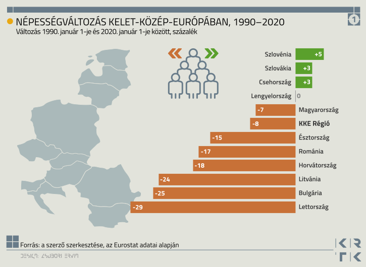Ezen belül azonban óriási eltéréseket figyelhetünk meg. Míg Lettországban, Bulgáriában és Litvániában a népességfogyás mértéke jóval meghaladta a 20%-ot is, addig Szlovéniában, Csehországban és Szlovákiában néhány százalékkal még emelkedett is a lakosság létszáma a rendszerváltást követő három évtizedben (1. ábra).