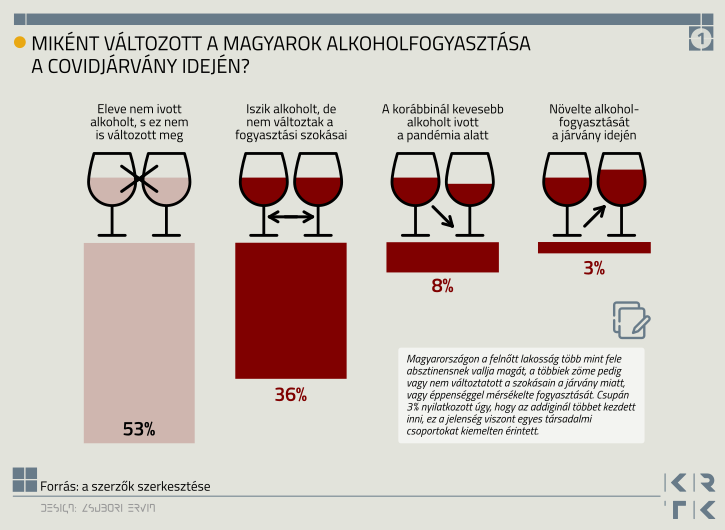 A felnőttek több mint fele, 53%-a egyáltalán nem iszik alkoholt, a többiek nagy része pedig nem változtatott a szokásain. Mindössze a válaszadók 3%-a jelezte, hogy növelte a fogyasztását. Ez a felszíni kép azonban elfedi, hogy a fogyasztás növekedése nagyon is koncentráltan jelent meg bizonyos társadalmi csoportokban.